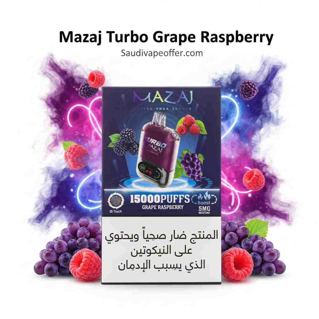 Mazaj Turbo Grape Raspberry 15000 Puffs is a premium disposable vape device that delivers a delicious blend of sweet grape and tangy raspberry flavours, with up to 15,000 puffs.